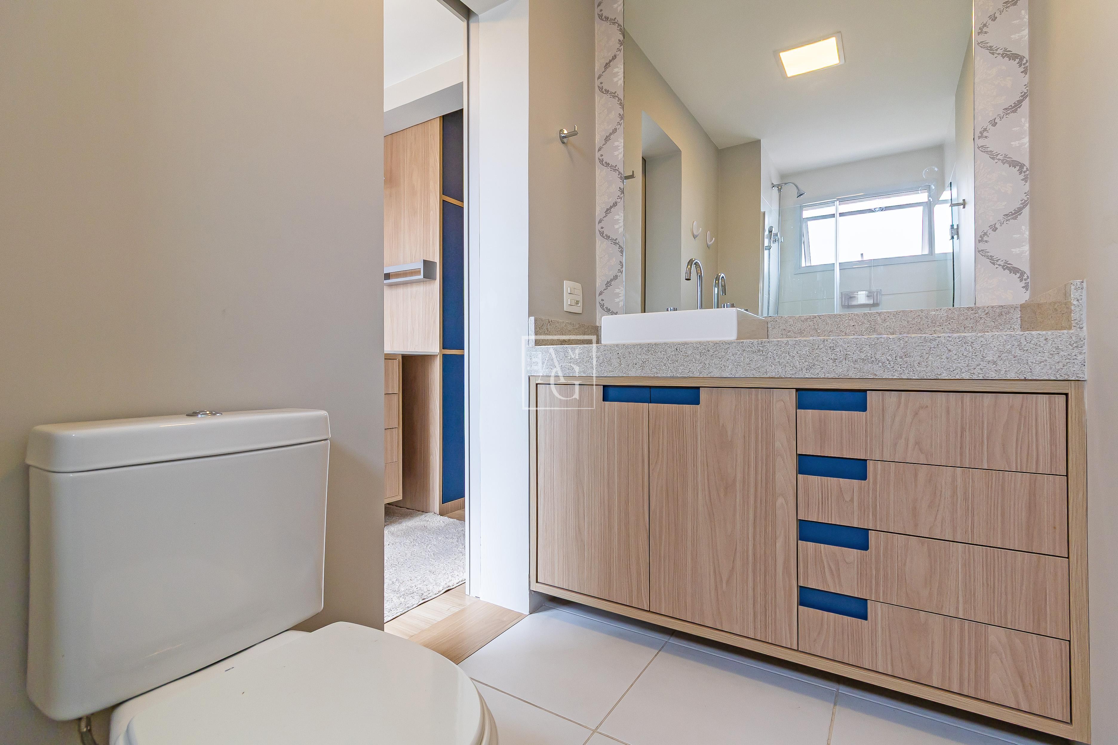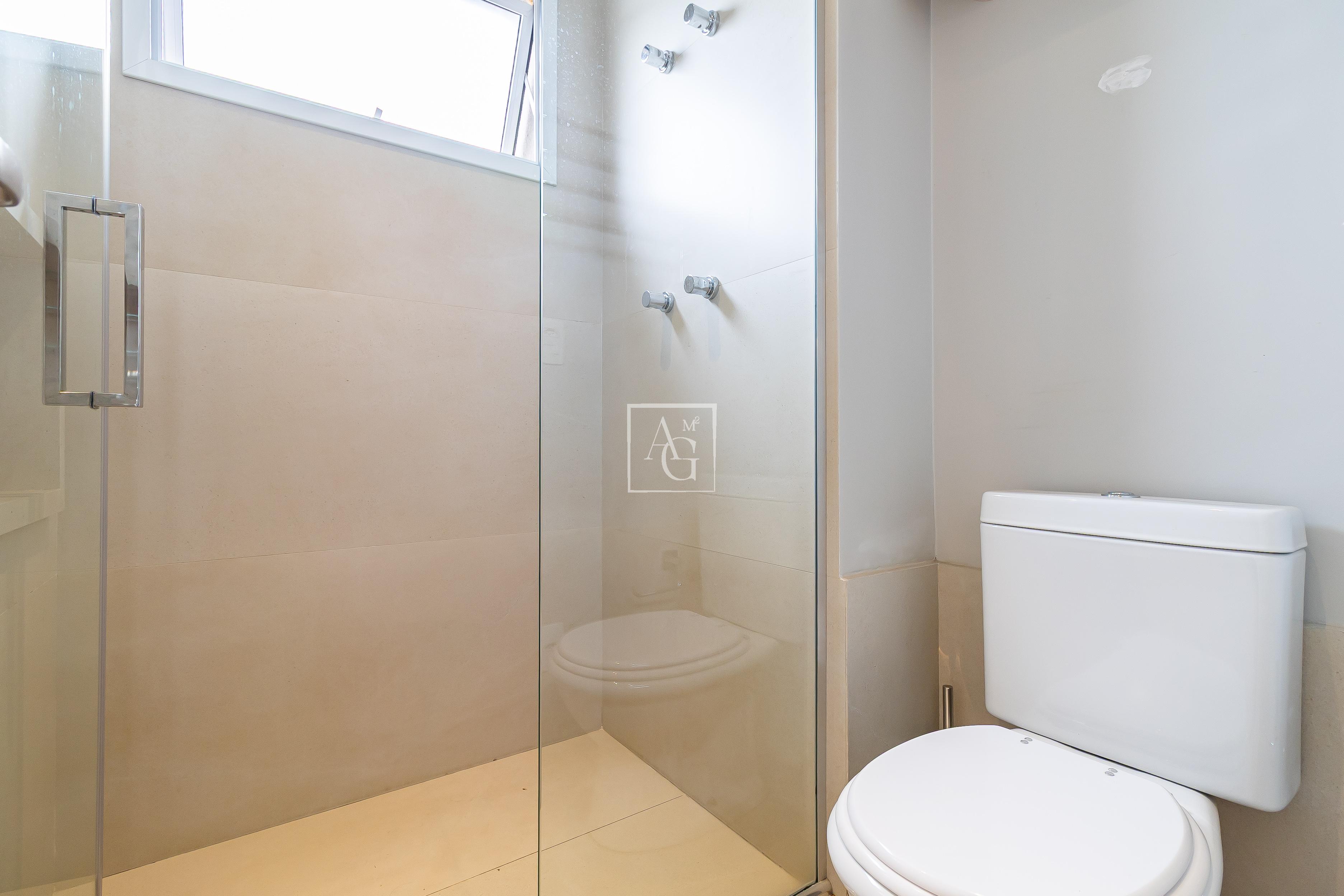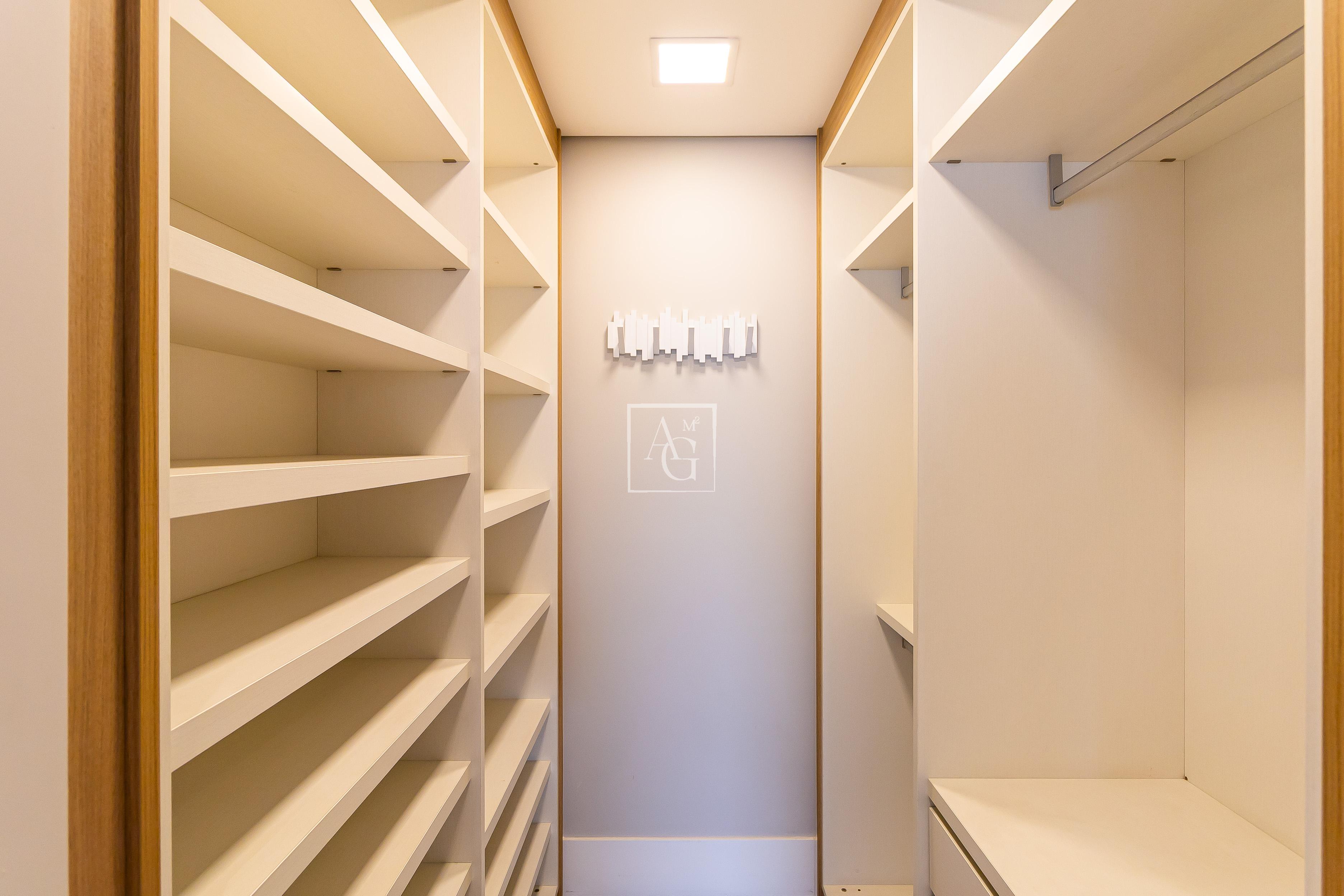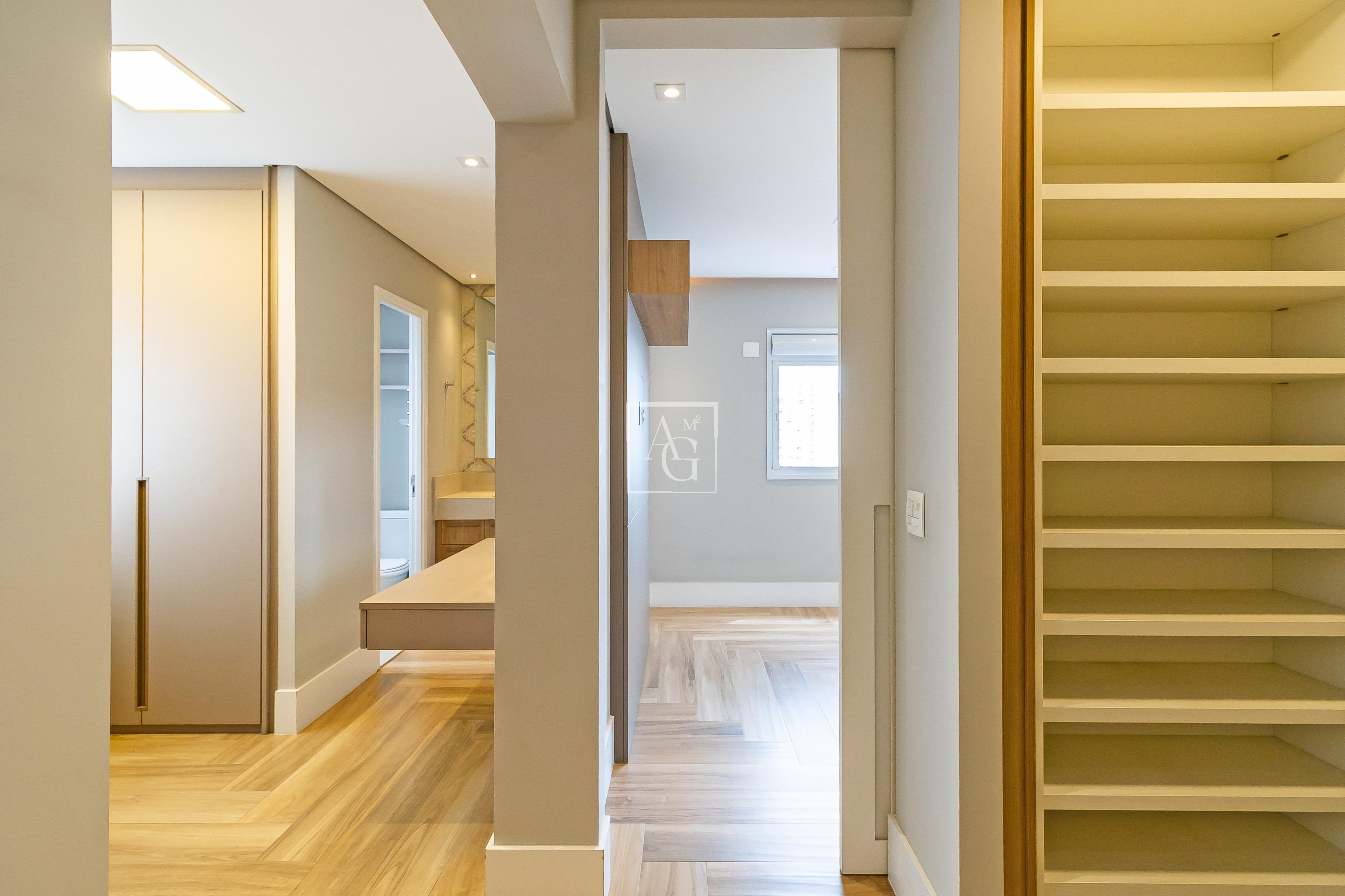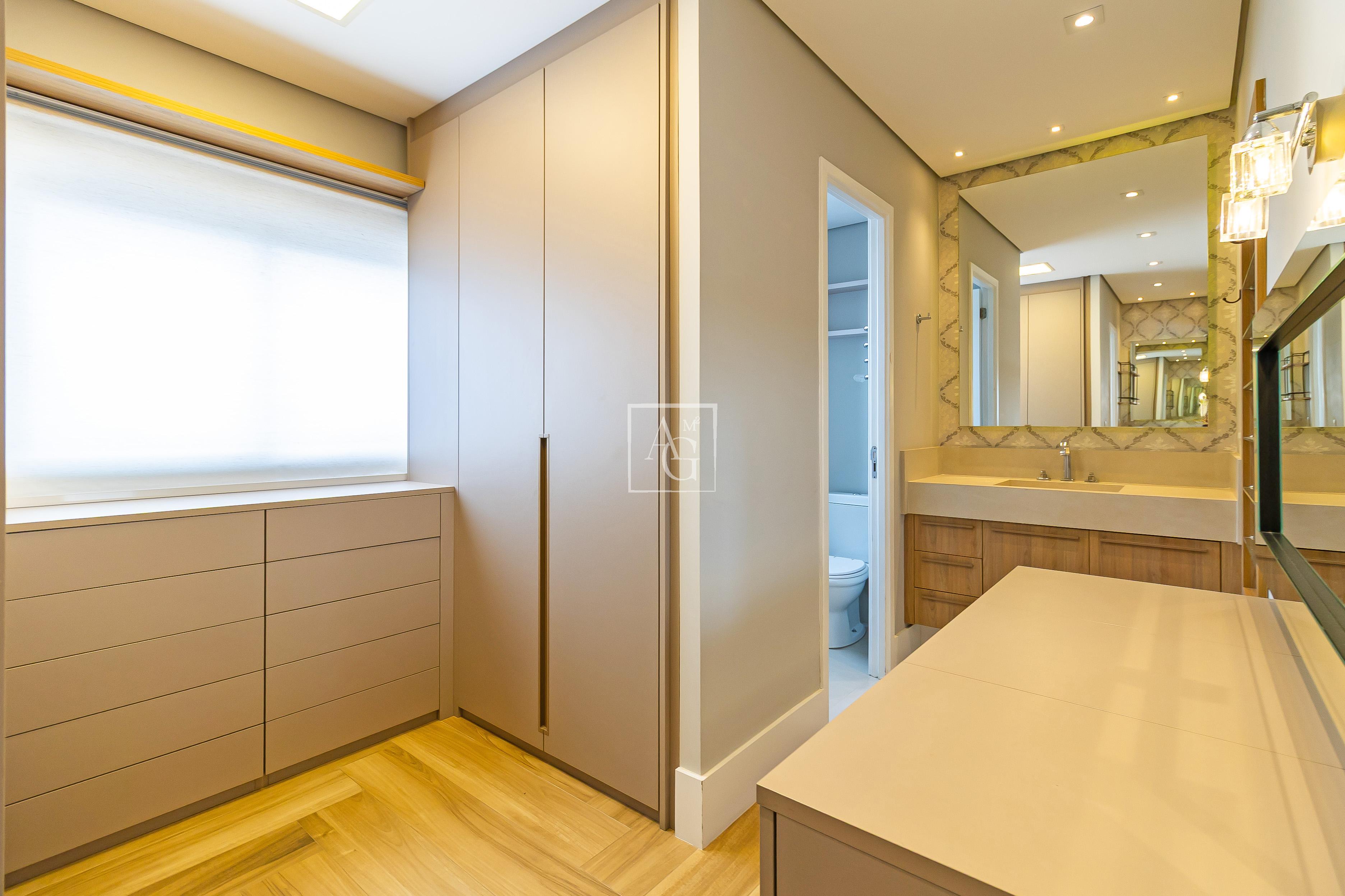 A unidade possui armários planejados nos quartos, banheiros e cozinha, além de closet, chuveiro a gás e área de serviço funcional.