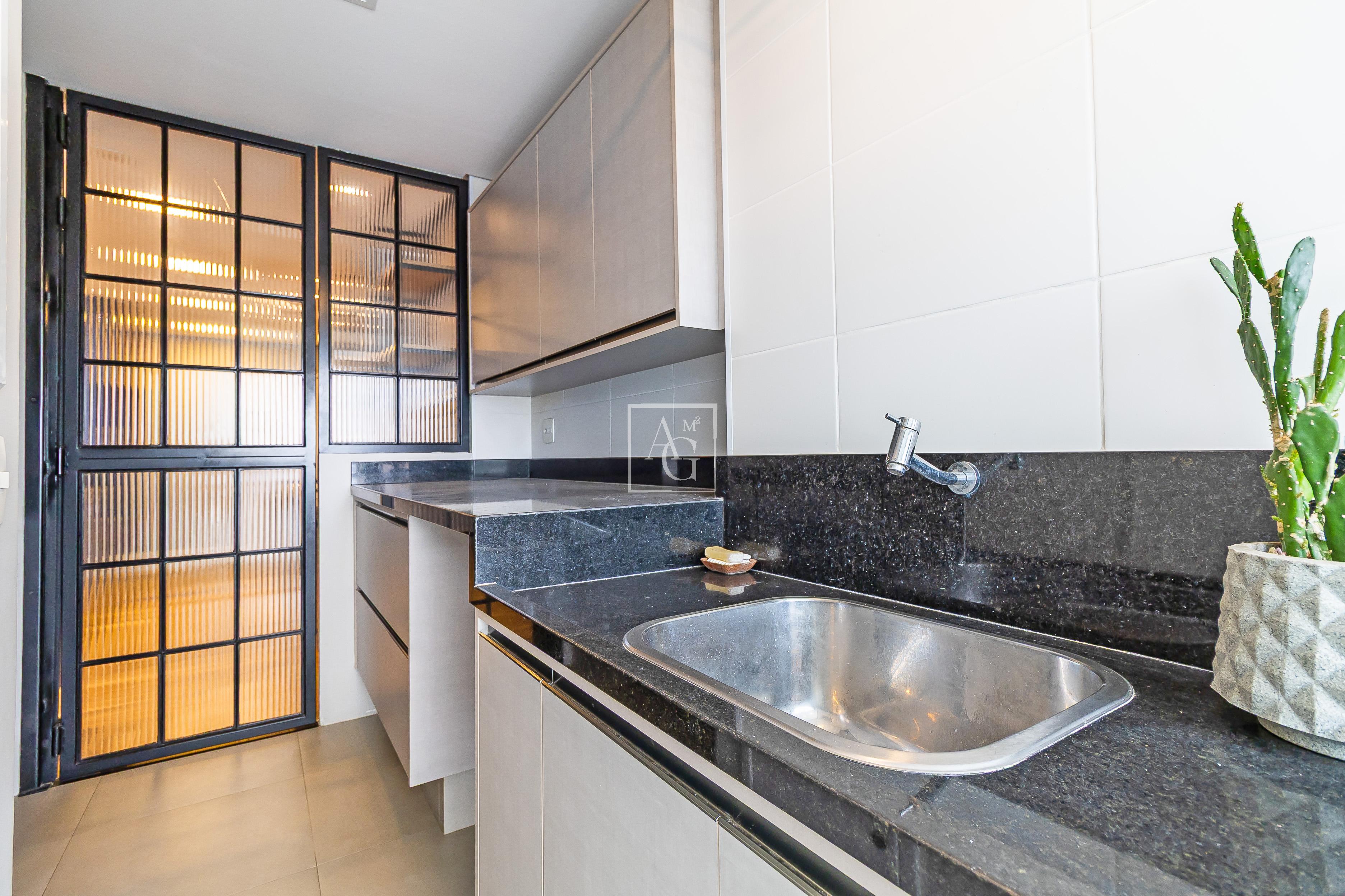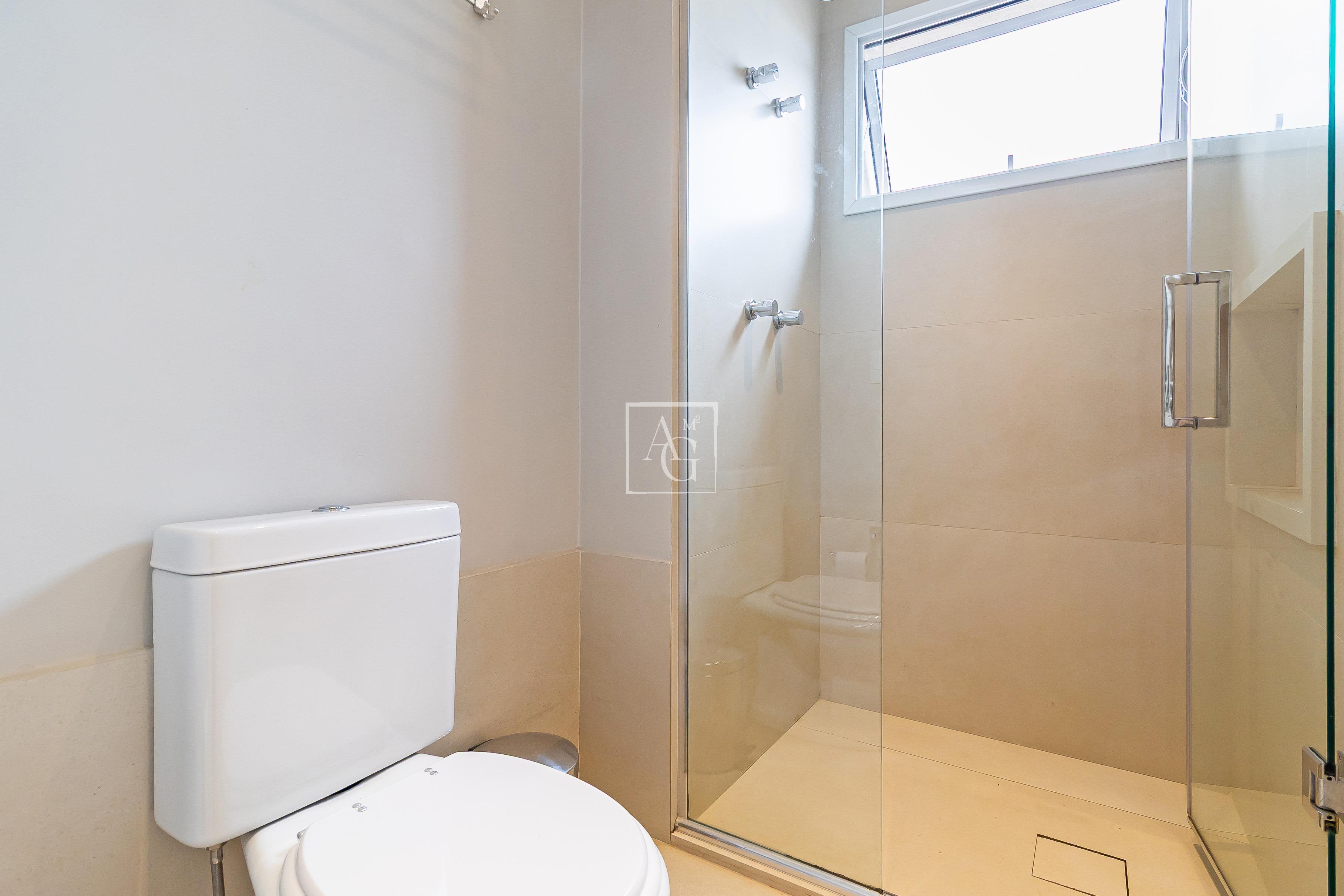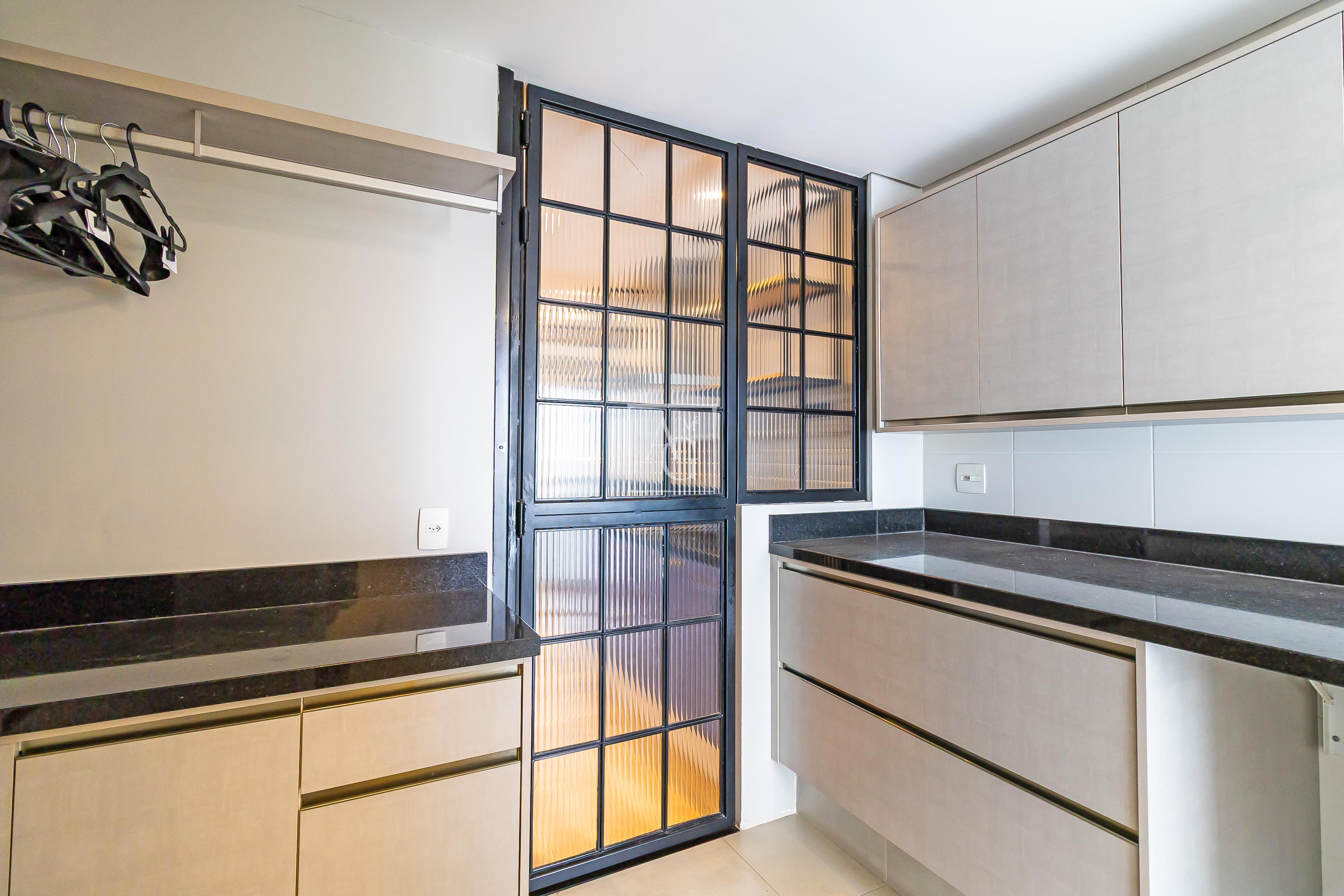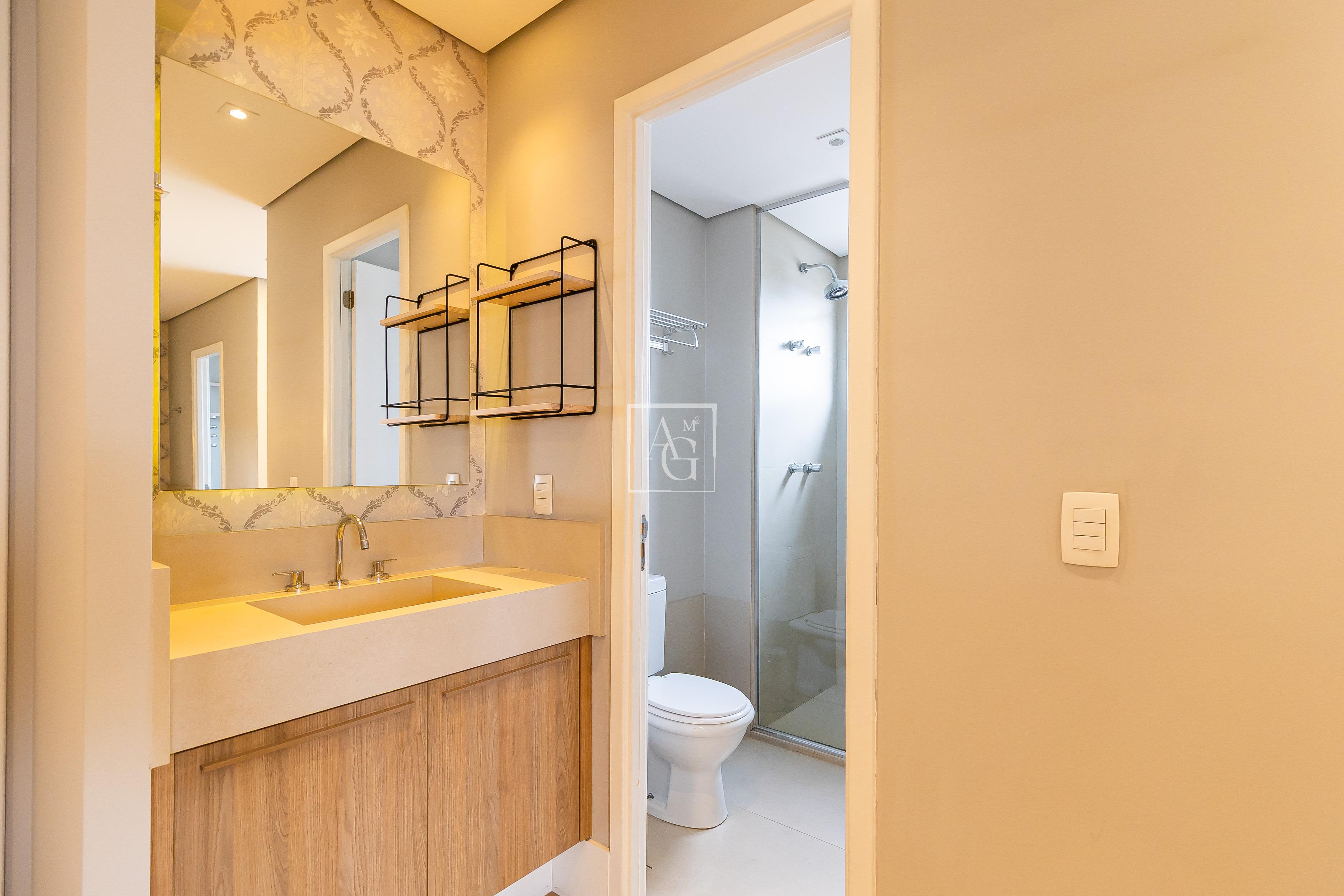 A unidade possui armários planejados nos quartos, banheiros e cozinha, além de closet, chuveiro a gás e área de serviço funcional.