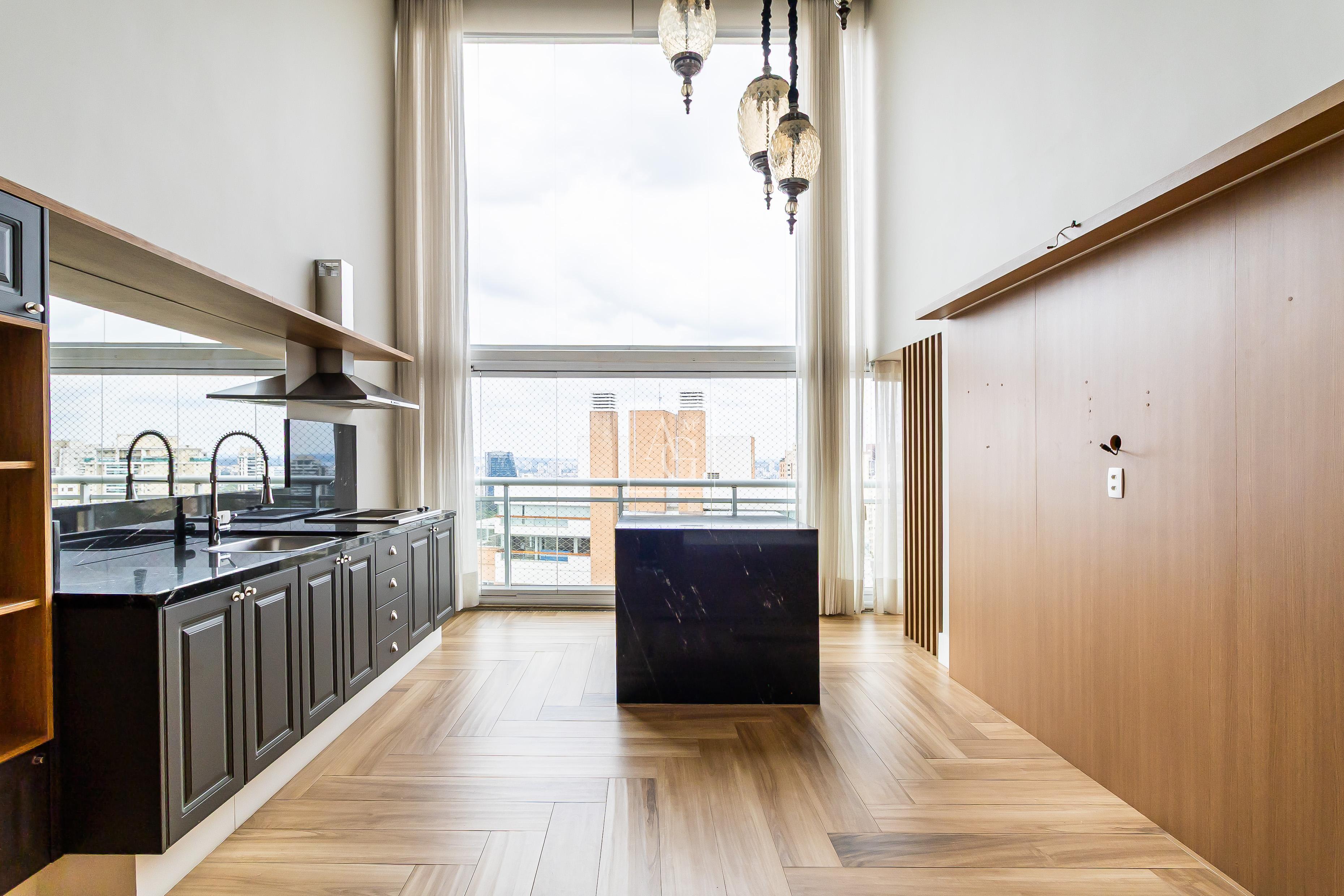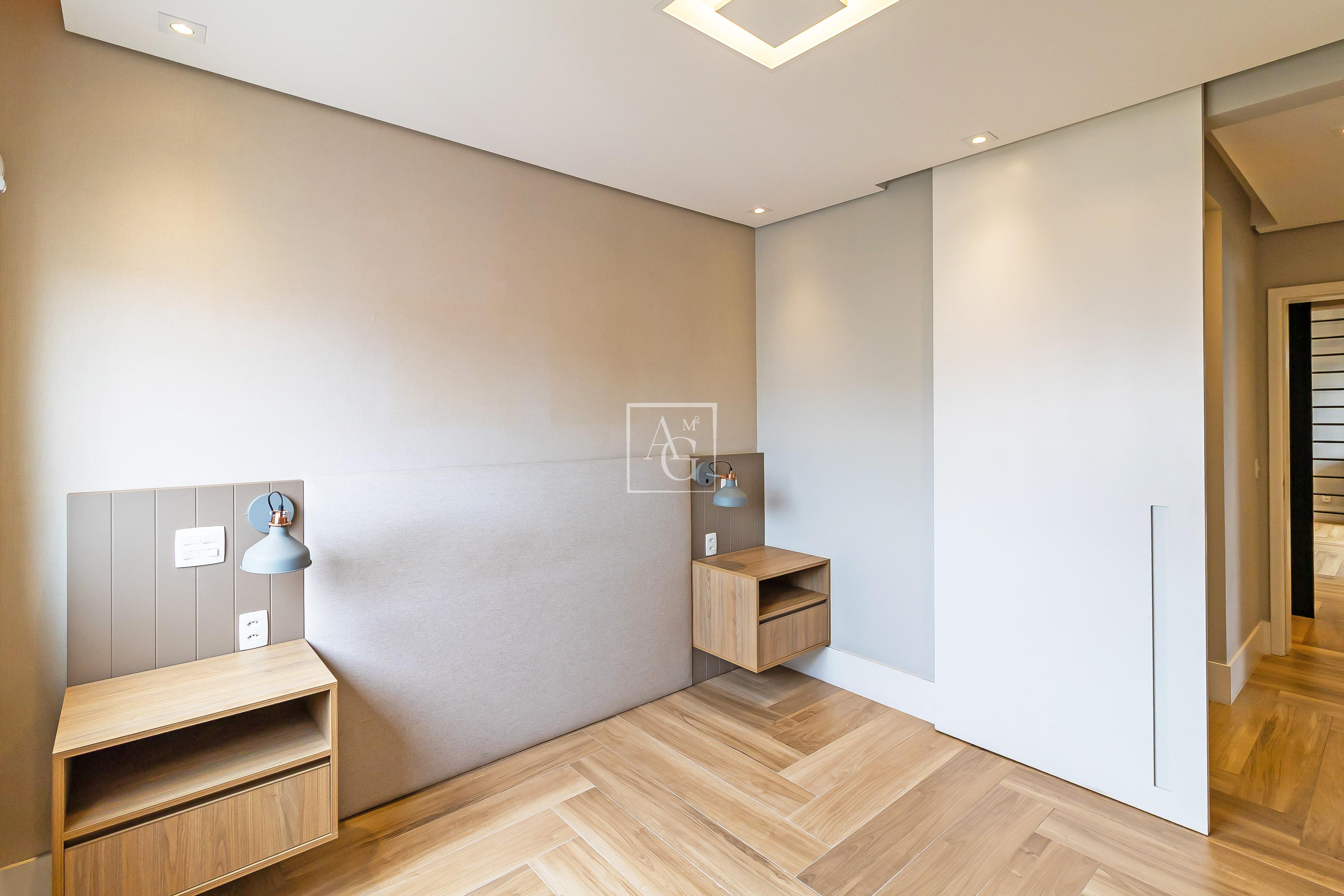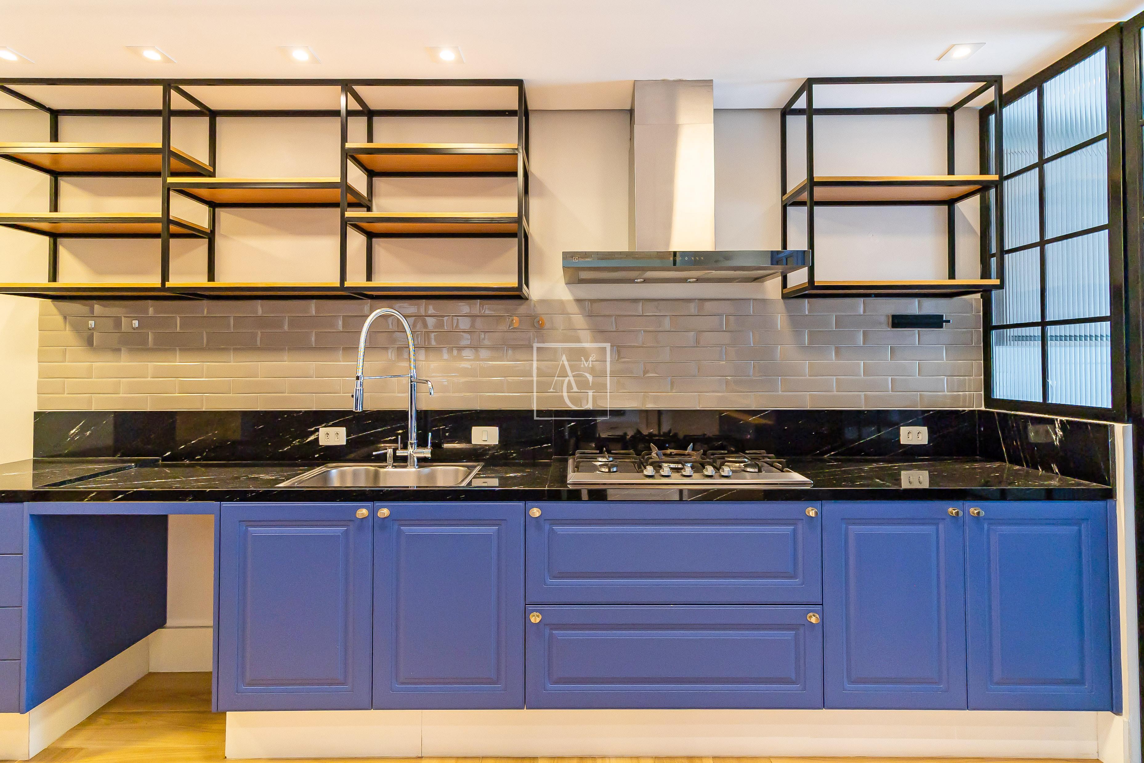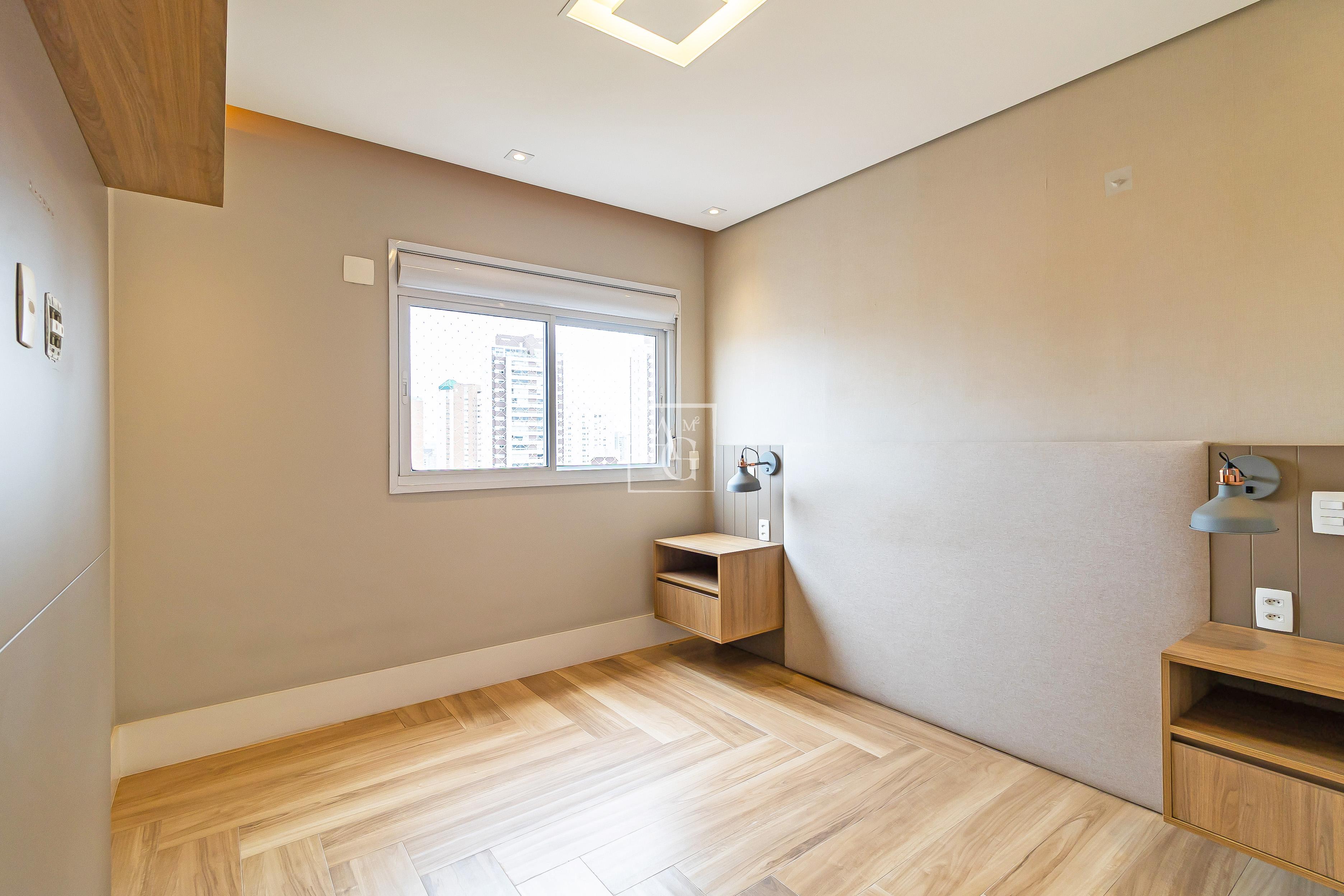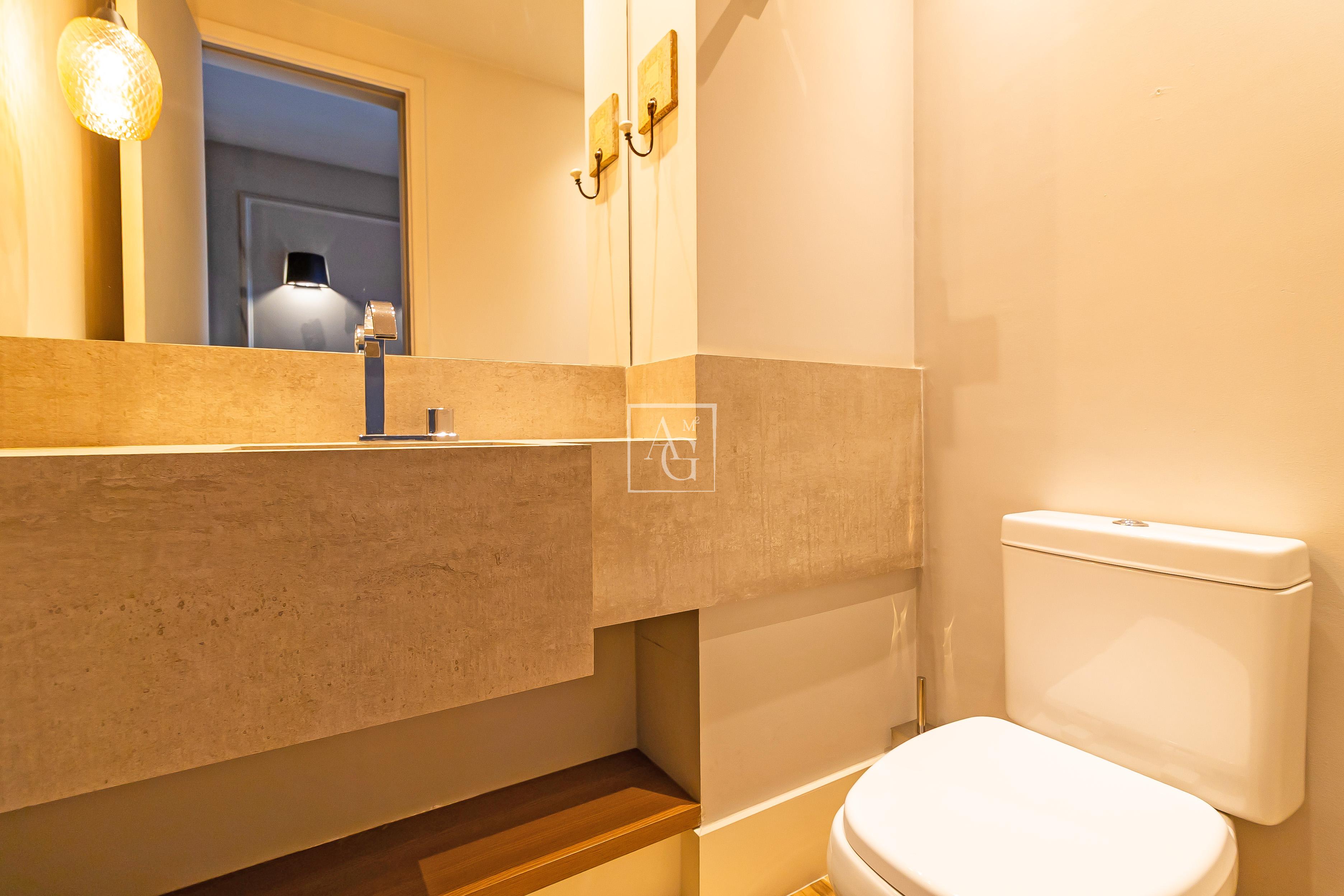 A unidade possui armários planejados nos quartos, banheiros e cozinha, além de closet, chuveiro a gás e área de serviço funcional.