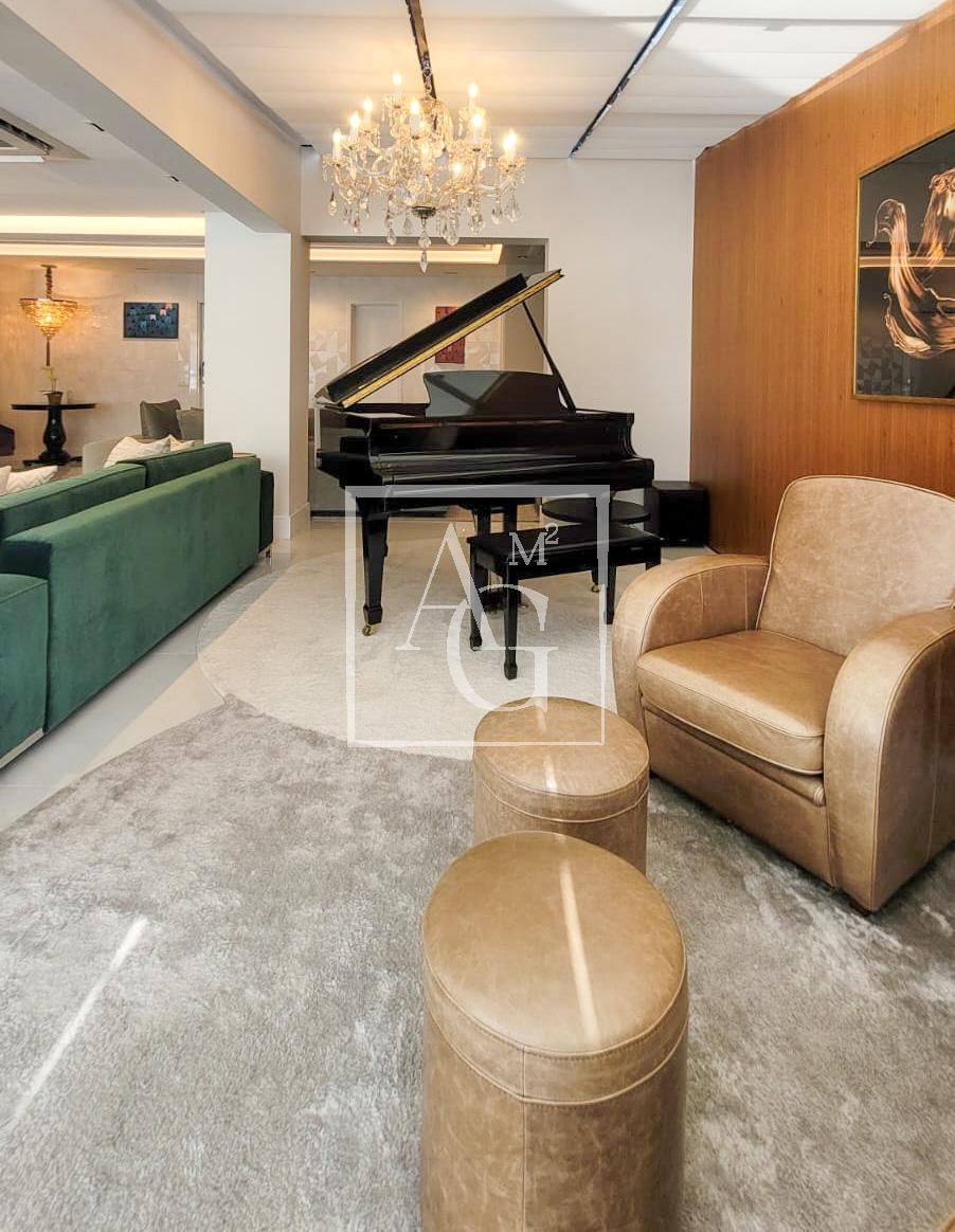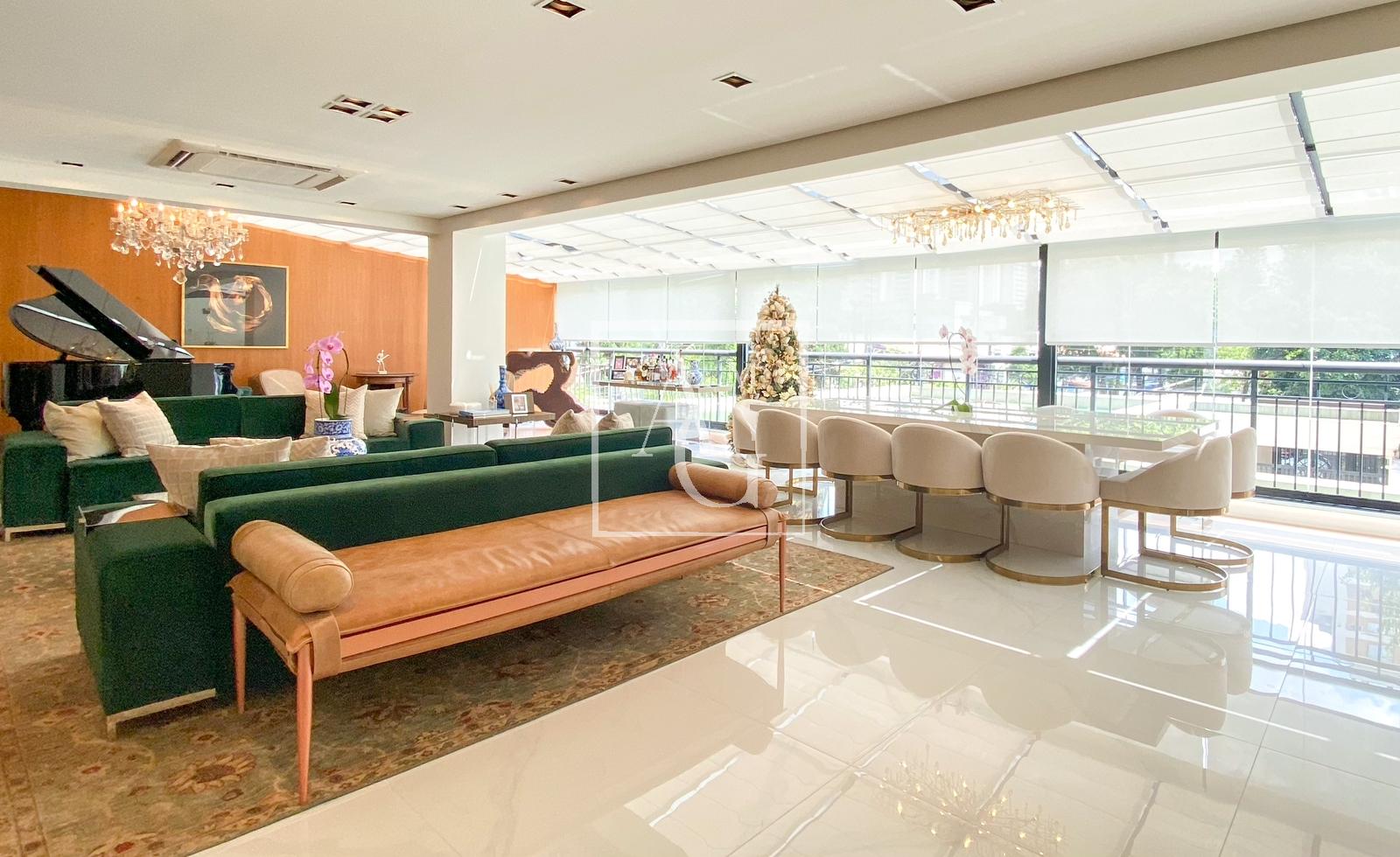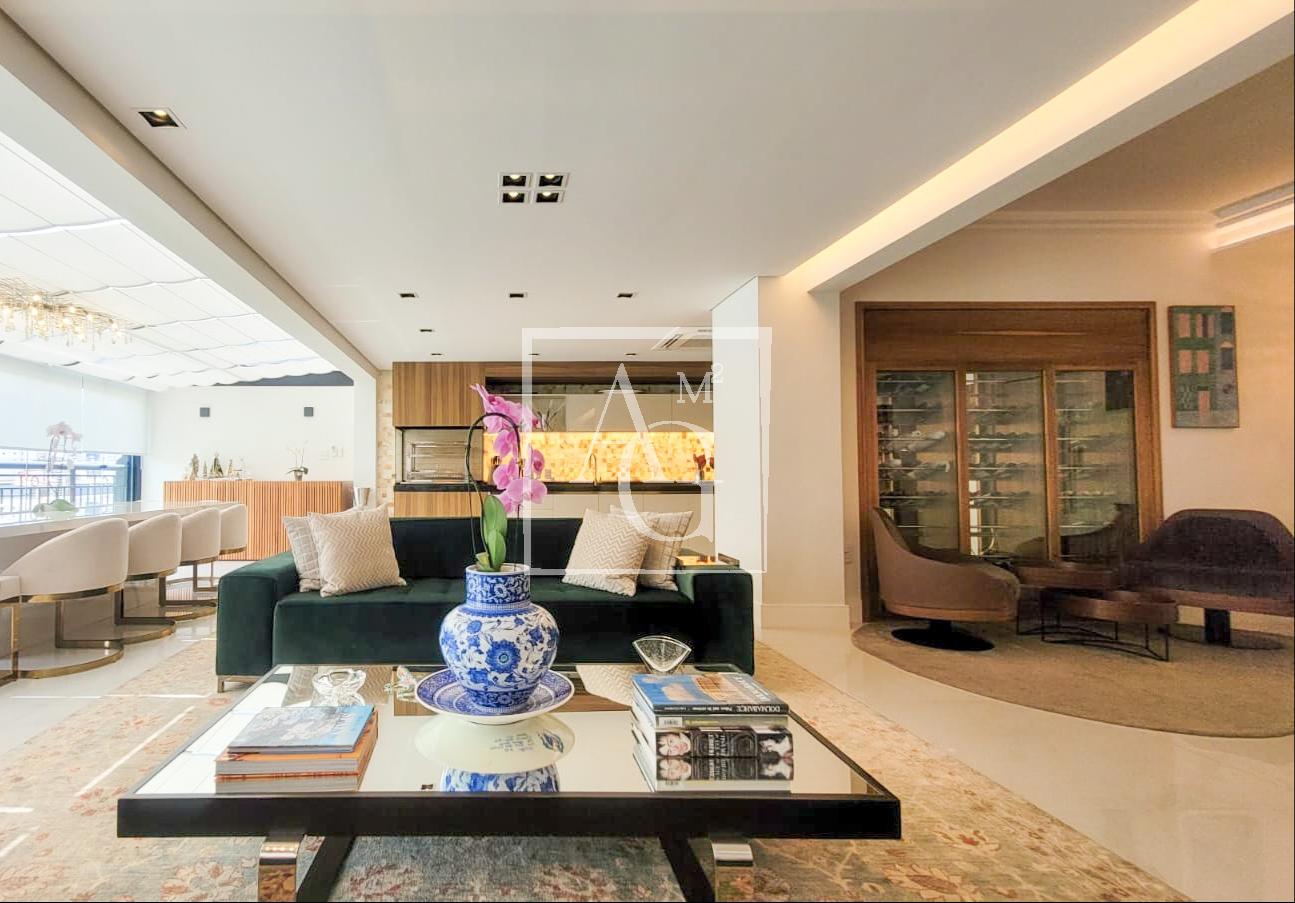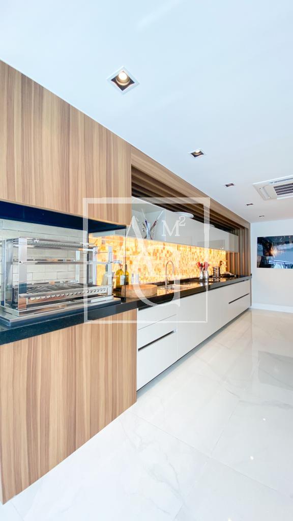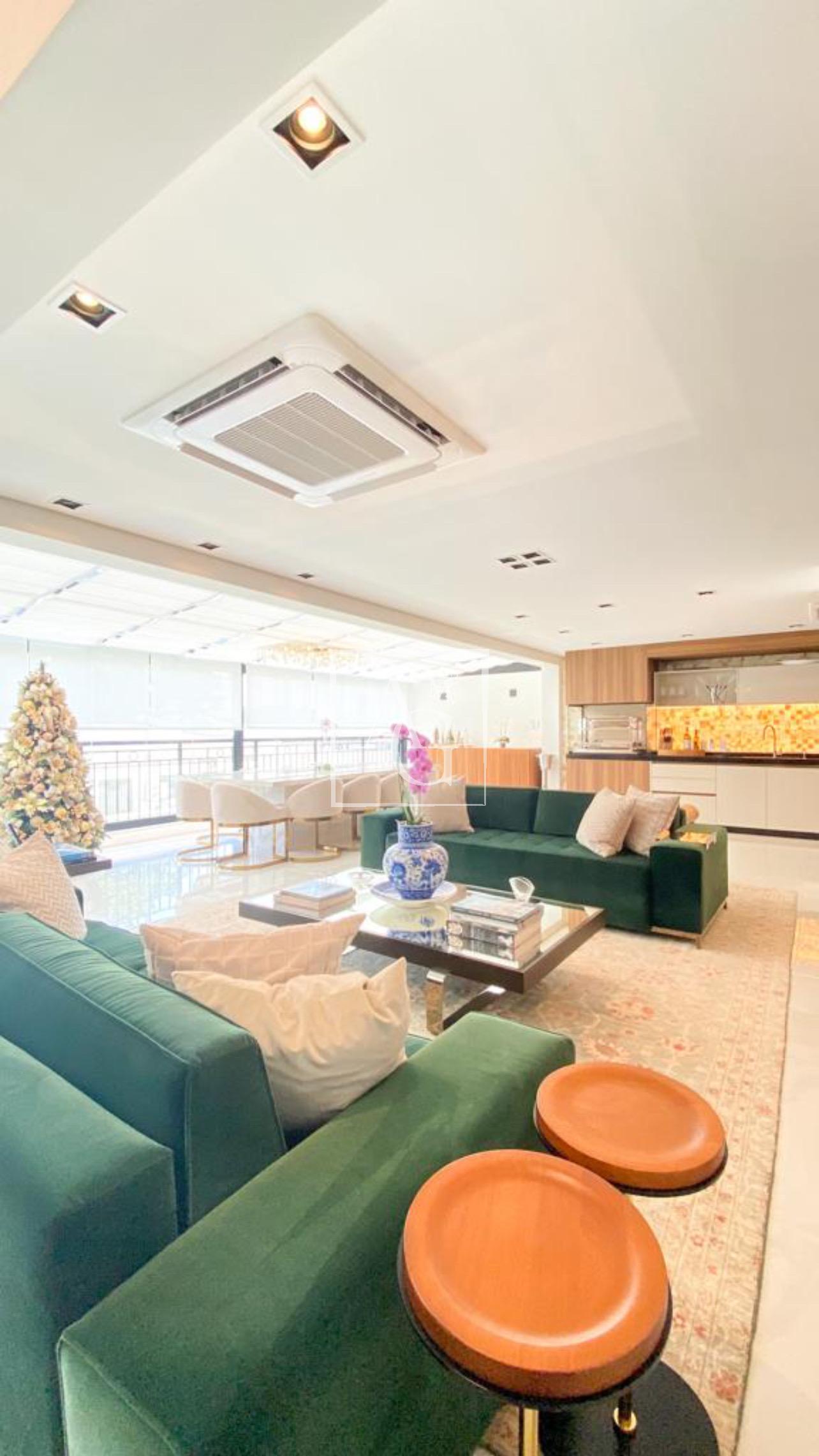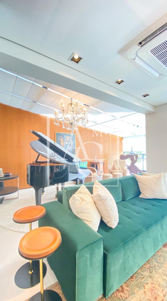 Apartamento com projeto da Débora Aguiar, em condomínio completo. O projeto tem conceito aberto, no qual 45 metros quadrados foram acrescidos ao living, totalizando 370 metros quadrados de área útil. Conta com varanda integrada, cozinha em linhas retas da Florence com acesso ao espaço gourmet por meio de portas de vidro deslizantes da Cinex Arch, sala de almoço espaçosa, dependência de funcionários e três suítes na parte íntima, todas com closet personalizado e saída para a varanda. O apartamento tem projeto de iluminação e automação total, inclusive nas cortinas blackout e no ar-condicionado, com capacidade de 200 mil BTUs. Conta ainda com acabamentos diferenciados e mobiliário de design. O prédio é moderno e tem lazer completo, além de oferecer quatro vagas na garagem e segurança 24 horas.