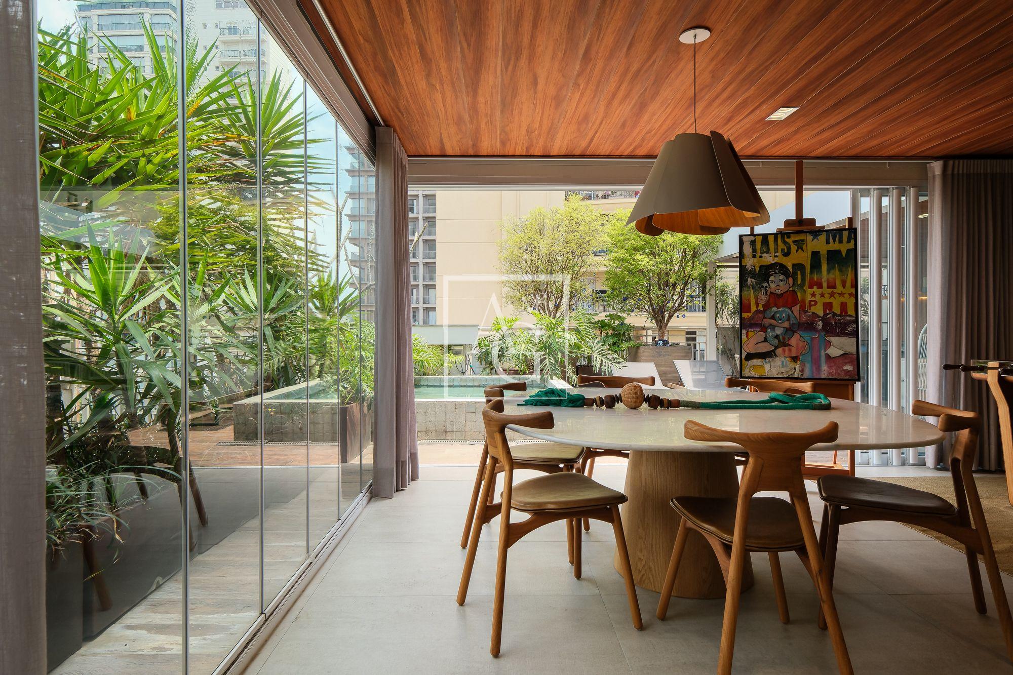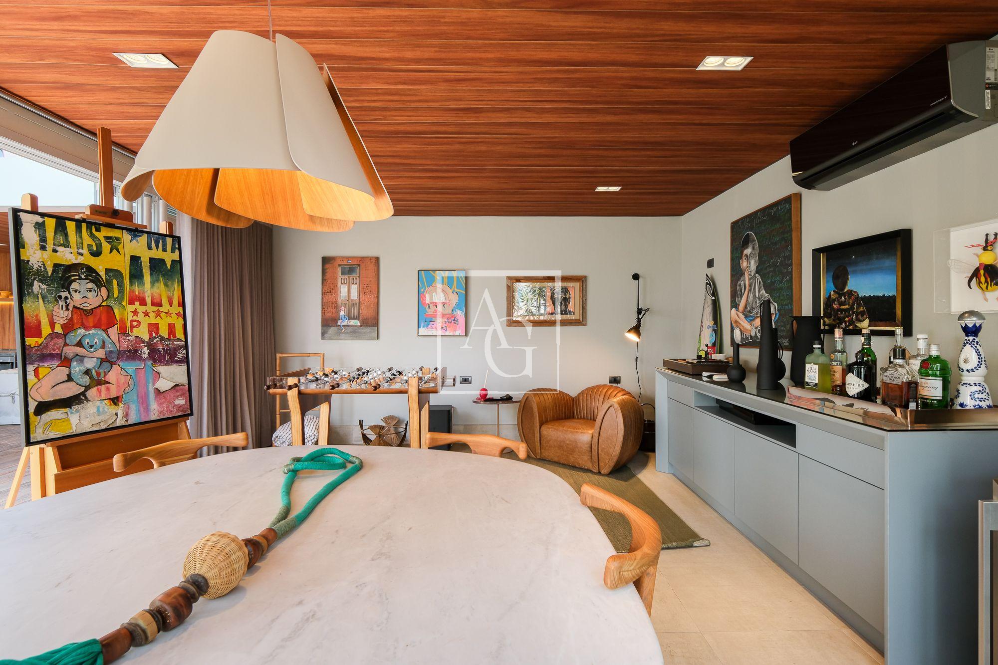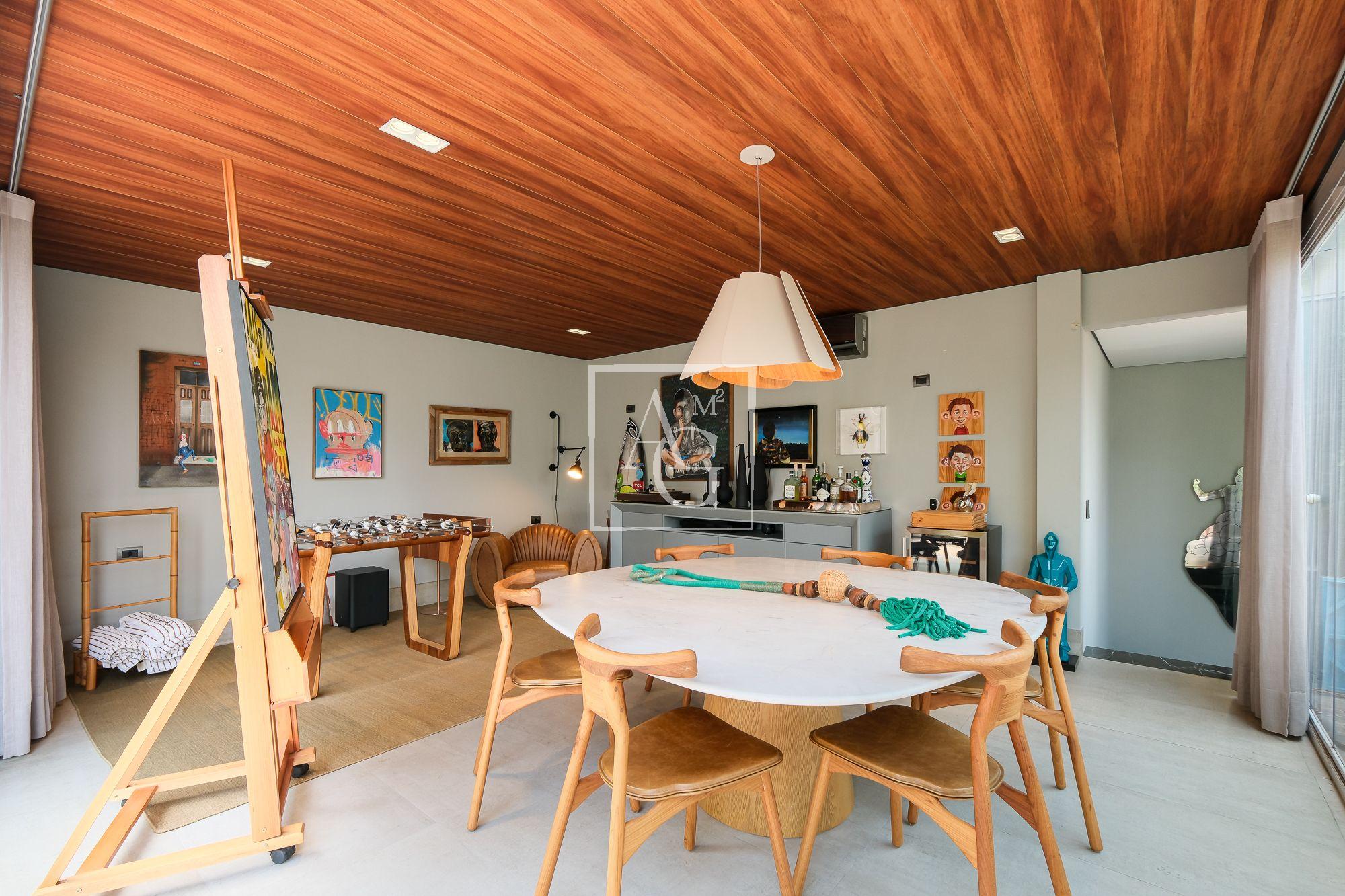 No piso superior, uma espaçosa sala se integra totalmente ao solarium, terraço descoberto e piscina, formando um ambiente perfeito para receber amigos e familiares com elegância e descontração.
