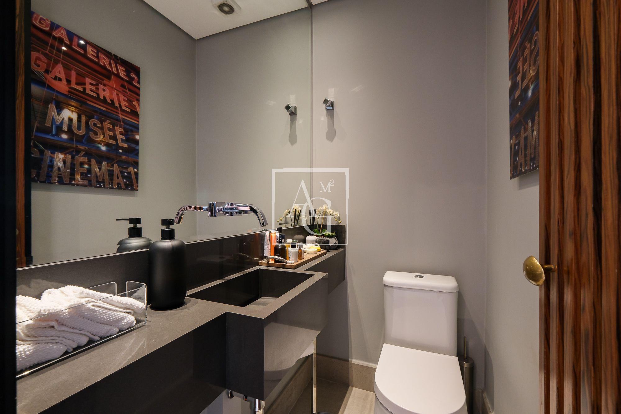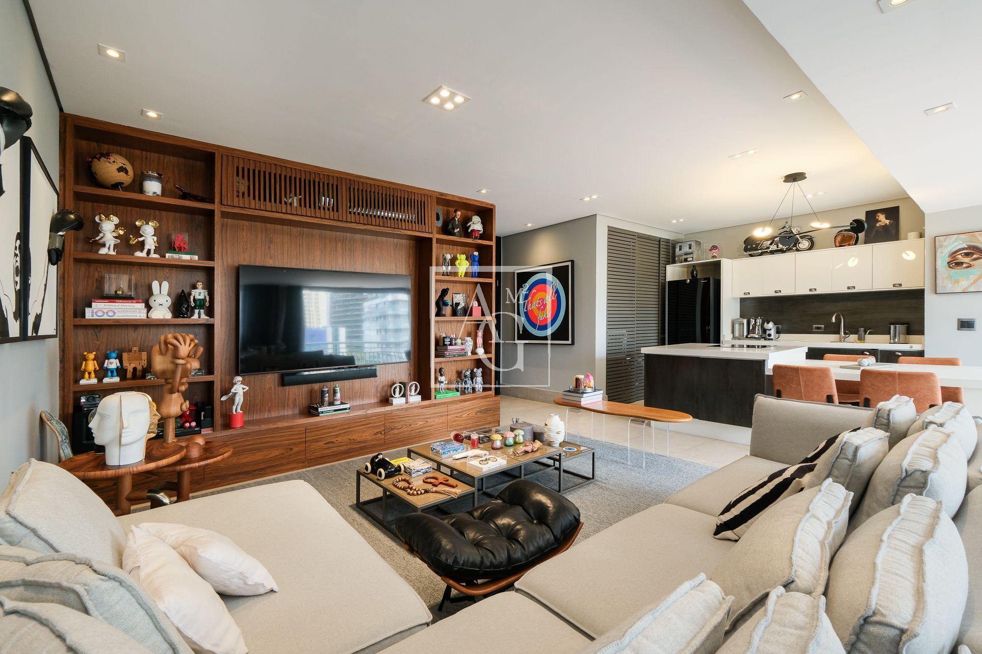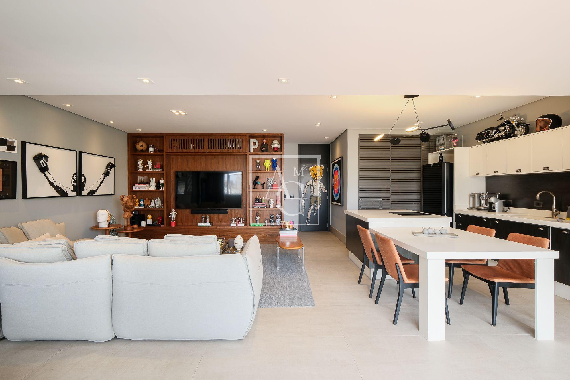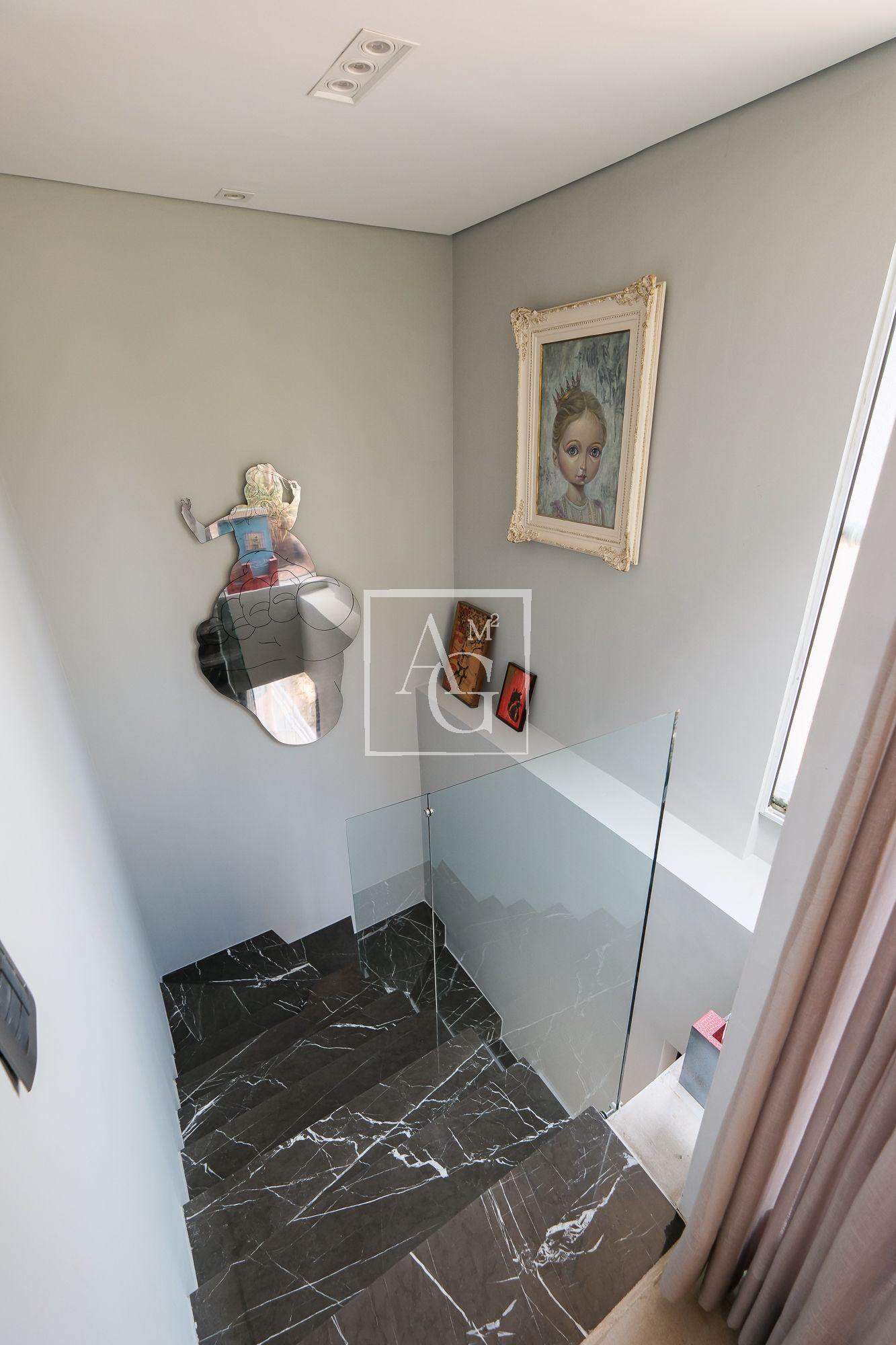 No piso superior, uma espaçosa sala se integra totalmente ao solarium, terraço descoberto e piscina, formando um ambiente perfeito para receber amigos e familiares com elegância e descontração.